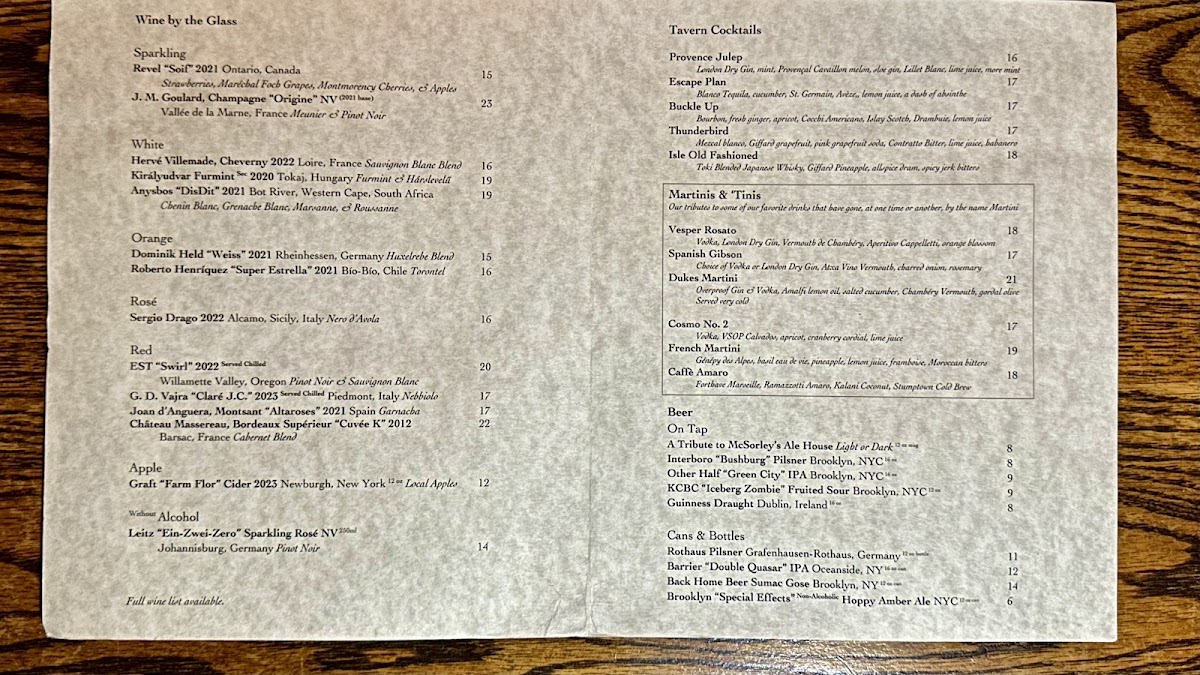 In addition to food, the menu includes a selection of cocktails and other beverages, such as the Ward Eight cocktail, complementing the dining experience.